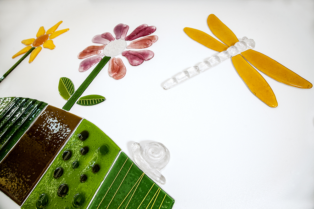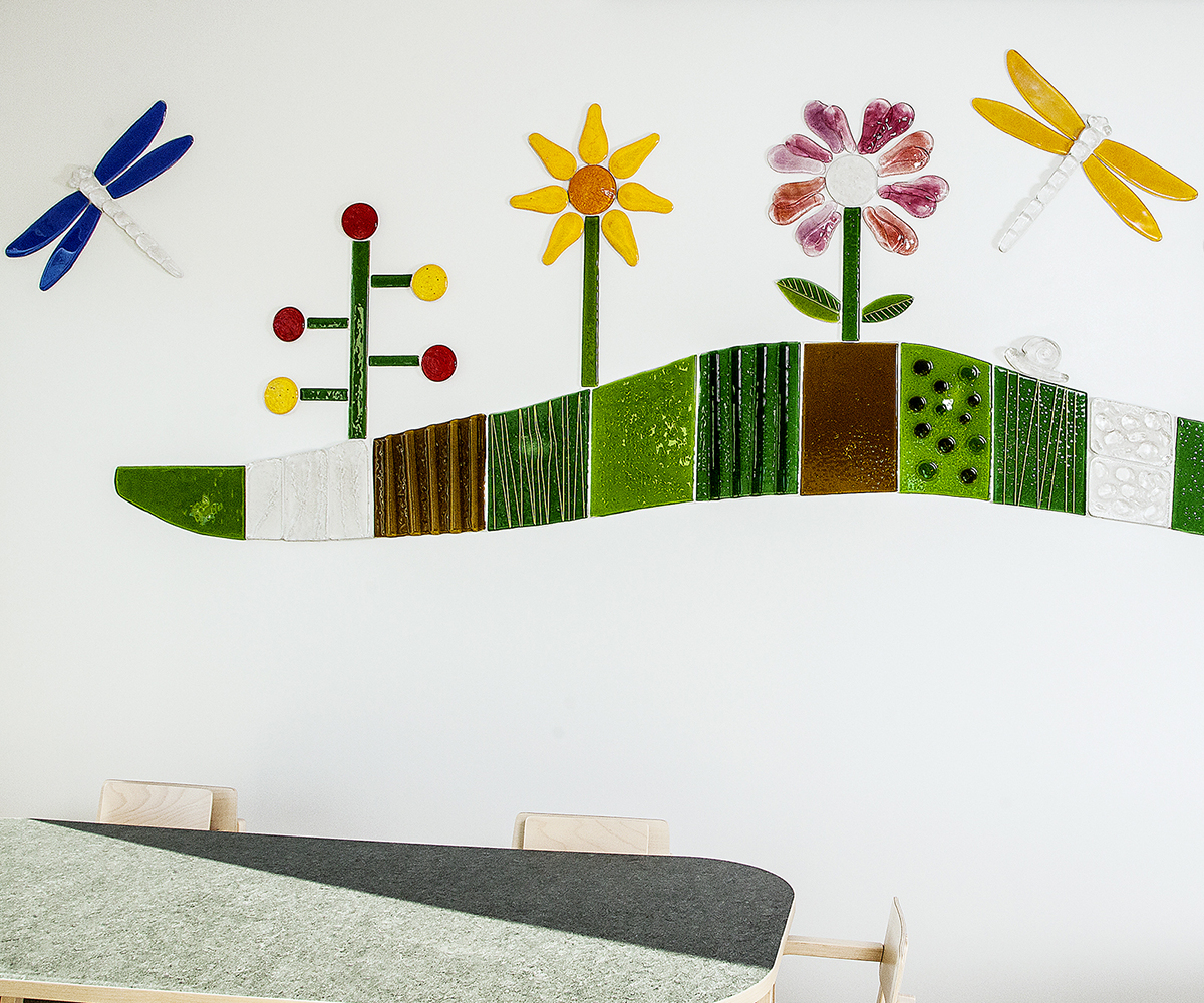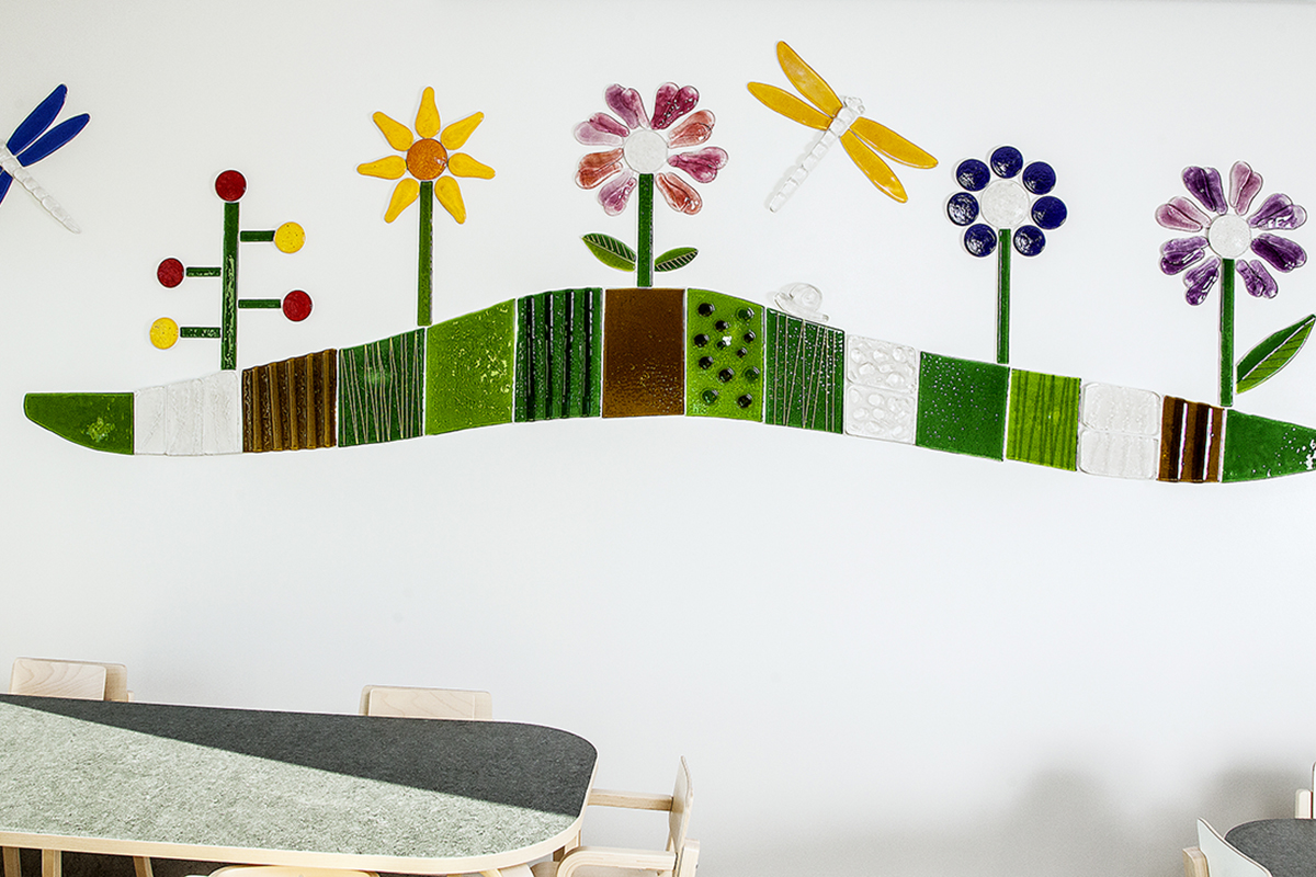 Jag vann en tävling att utsmycka en vägg i matsal samt ett trapphus till Förskolan Rosenhill i Lyckeby. Här valde jag att arbeta med naturens avtryck genom att gestalta en sommaräng i matsalen och havets djup i trapphuset. Jag tillverkade glasmosaik i fusing, sandgjöt samt frihandsblåste vissa detaljer. Barnen integrerades i skapandeprocessen genom att själva göra avtryck i lera utav grenar, stenar och snäckor de plockat. Barnen var även med i glashyttan under en del av tillverkningsprocessen för att se det varma glaset formas i sanden.