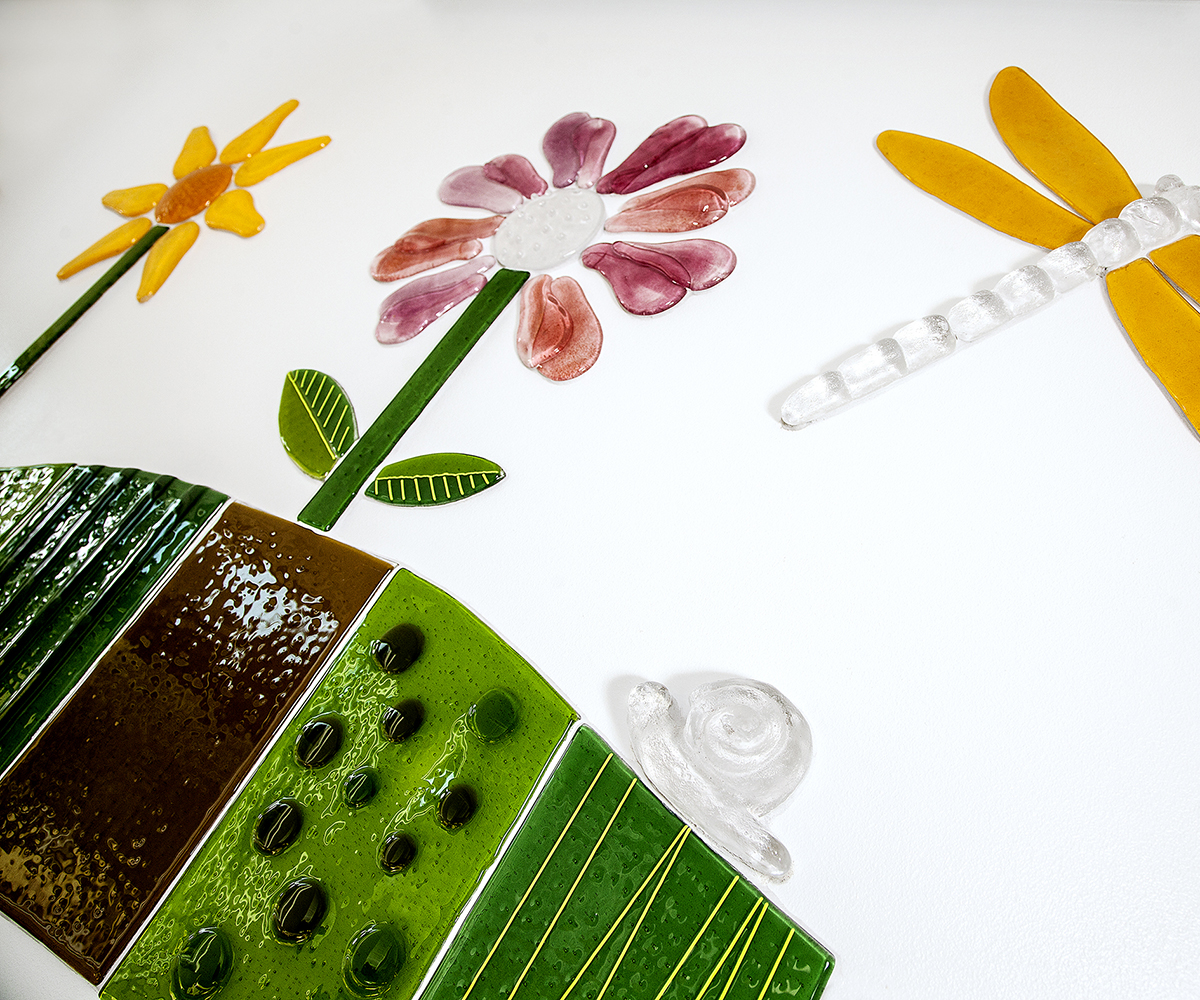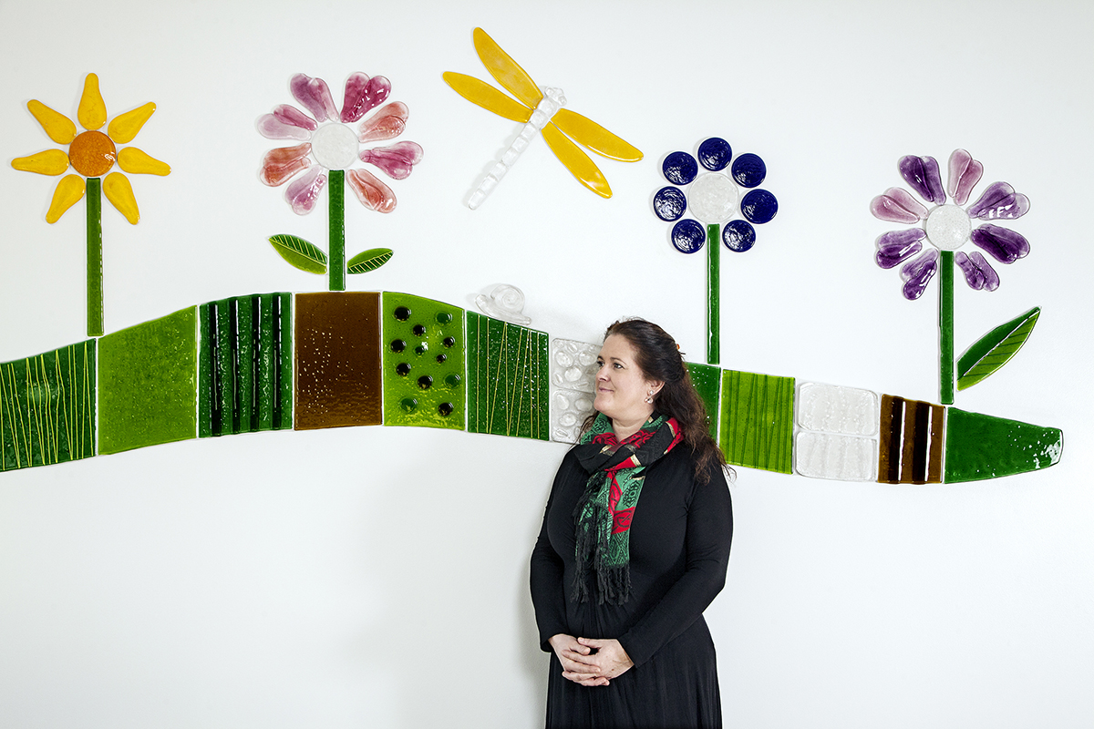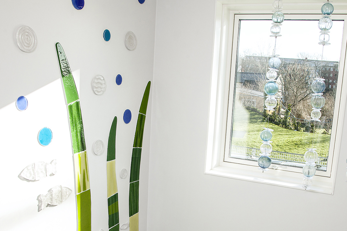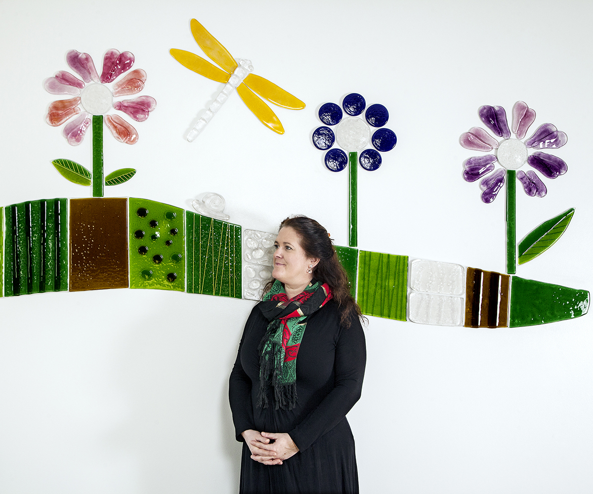 Jag vann en tävling att utsmycka en vägg i matsal samt ett trapphus till Förskolan Rosenhill i Lyckeby. Här valde jag att arbeta med naturens avtryck genom att gestalta en sommaräng i matsalen och havets djup i trapphuset. Jag tillverkade glasmosaik i fusing, sandgjöt samt frihandsblåste vissa detaljer. Barnen integrerades i skapandeprocessen genom att själva göra avtryck i lera utav grenar, stenar och snäckor de plockat. Barnen var även med i glashyttan under en del av tillverkningsprocessen för att se det varma glaset formas i sanden.
