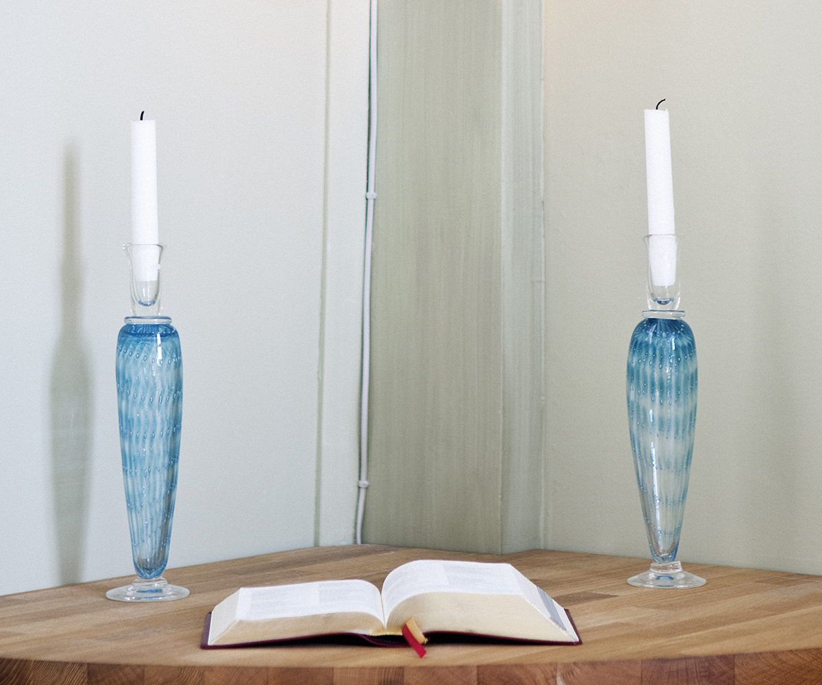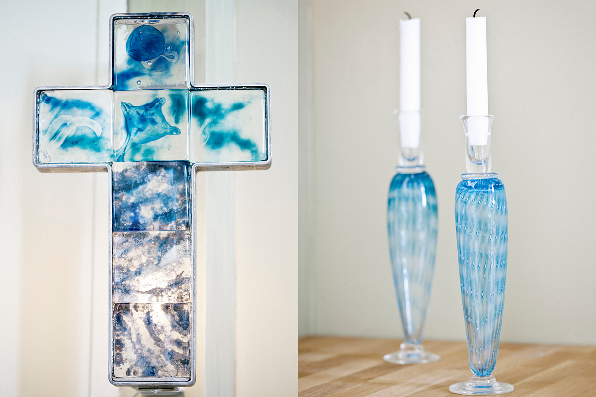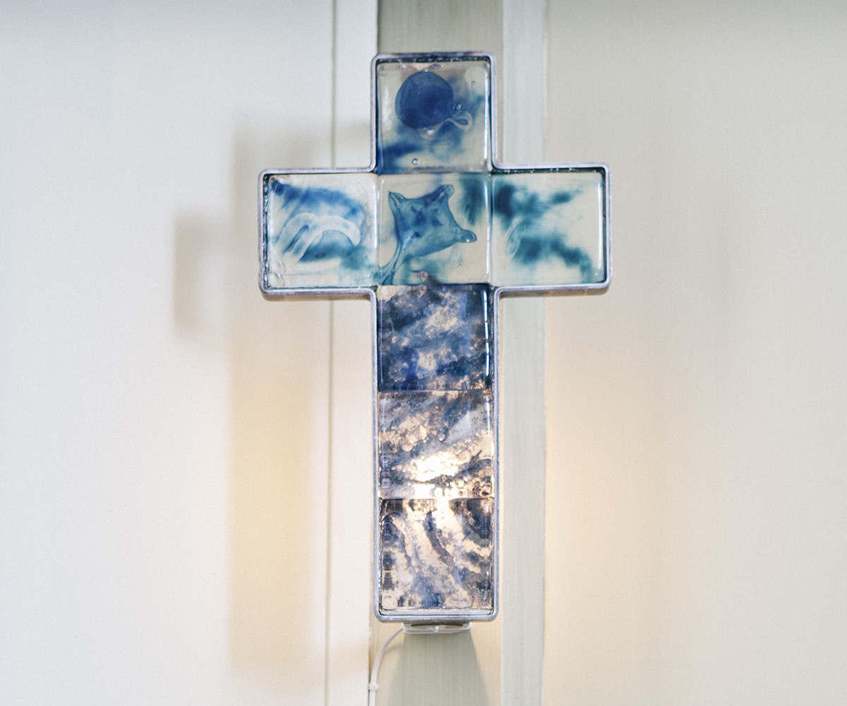 Efter att ha tillverkat en Tacksägelseskål åt Amiralitetsförsamlingen 2003 anlitade Kyrkorådet mig åter för att göra ett kors med två tillhörande ljusstakar till församlingens Sakristia. Jag valde att arbeta med blåa nyanser då det är en kyrka starkt präglad av en marin stad. Jag gjöt glasblock som jag därefter fäste i en rostfri ram. Två tillhörande ljusstakar med luftbubblor.