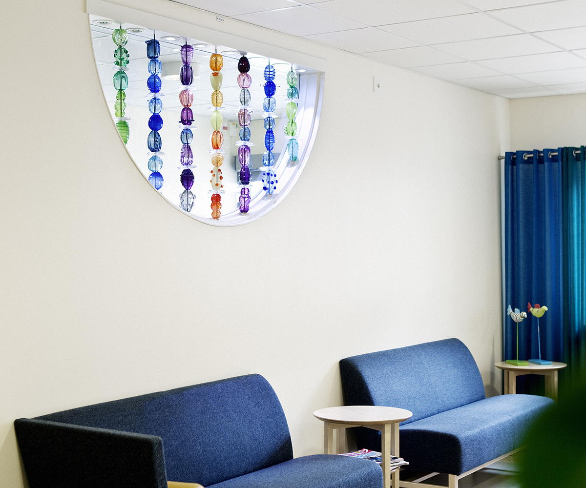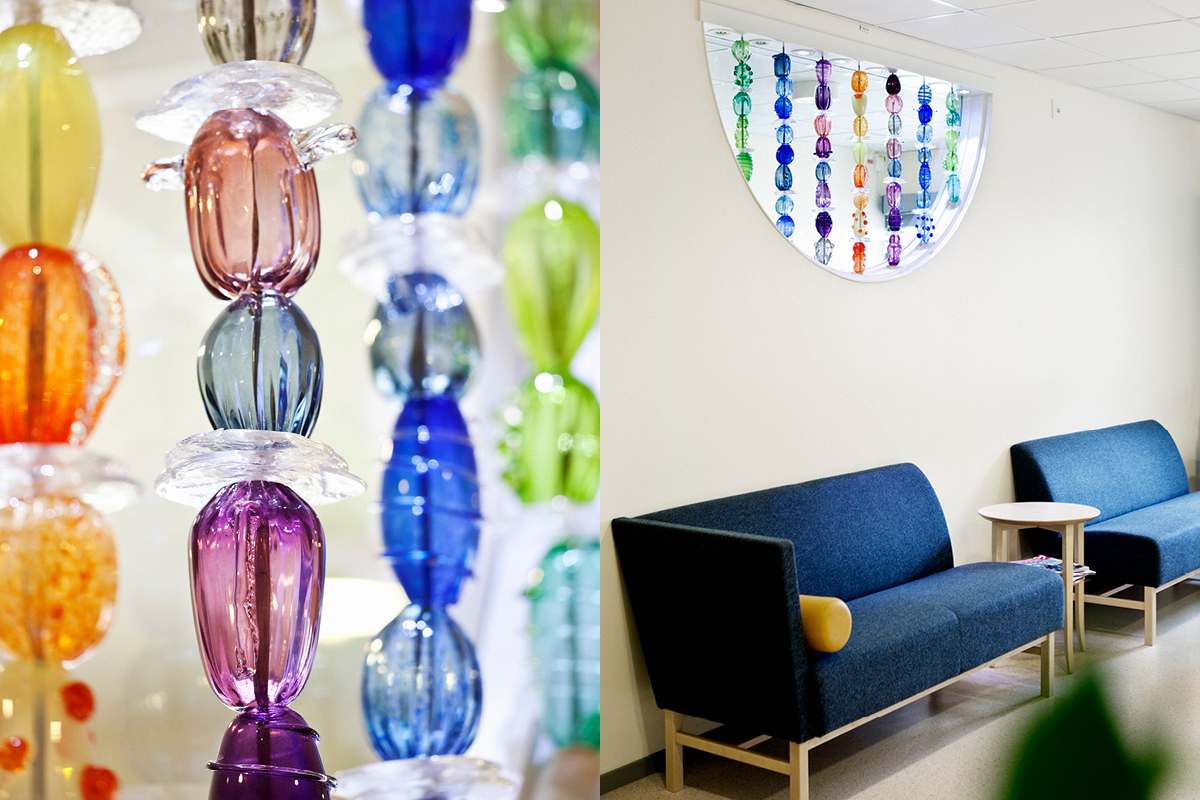Habiliteringen i Karlskrona gav mig i uppdrag att gestalta deras väntrum. Hit kommer föräldrar med sitt barn för utredning och behandling. Jag ville skapa en färgglad upplevelse i det tomrum som uppstod i ett fönster i väntrummet ut mot ingången. Blåsta former i regnbågens alla färger. Gjorde här även sex tavlor, s.k Frökapslar i en korridor.