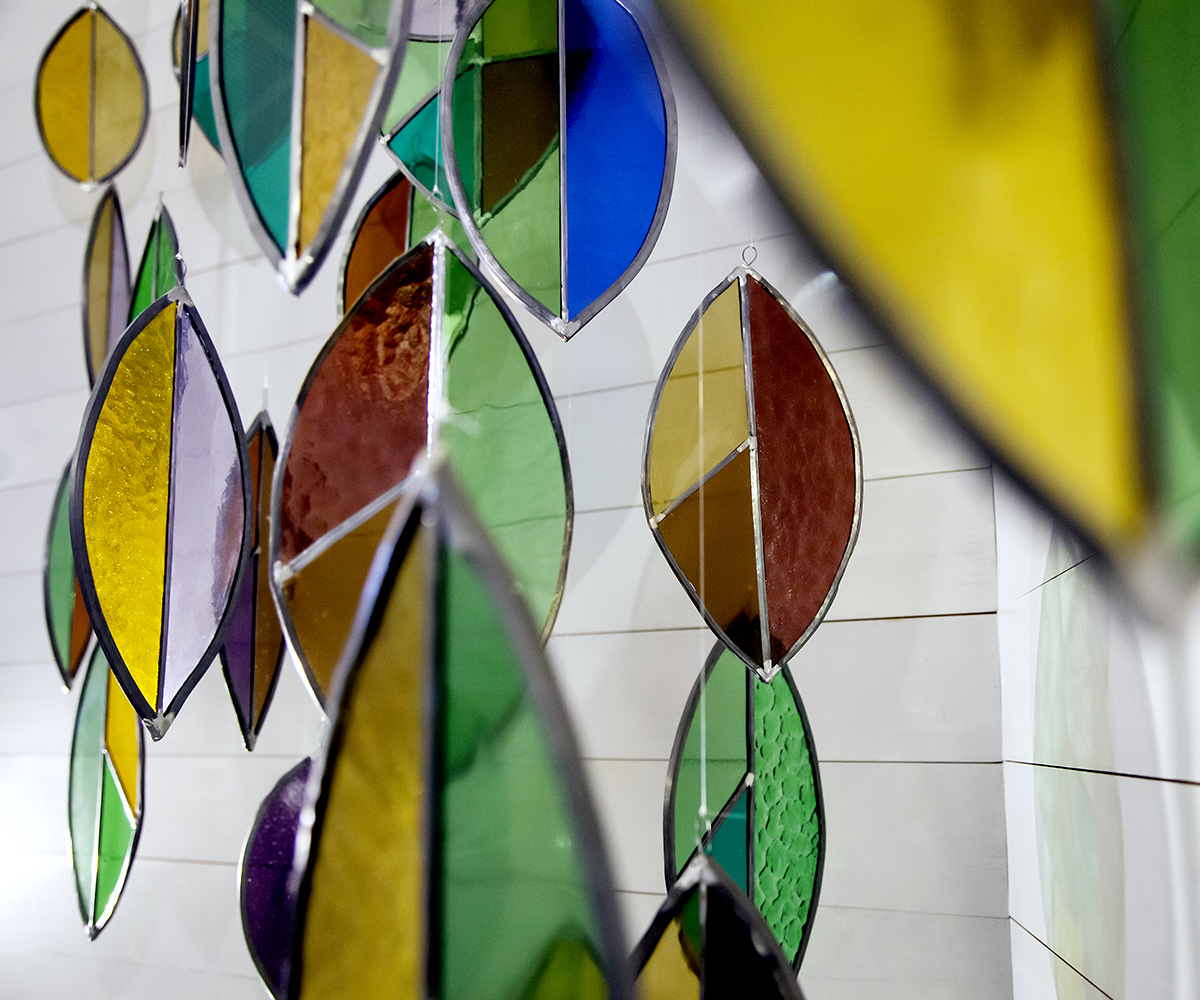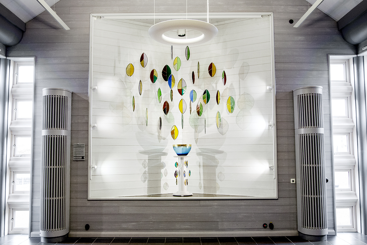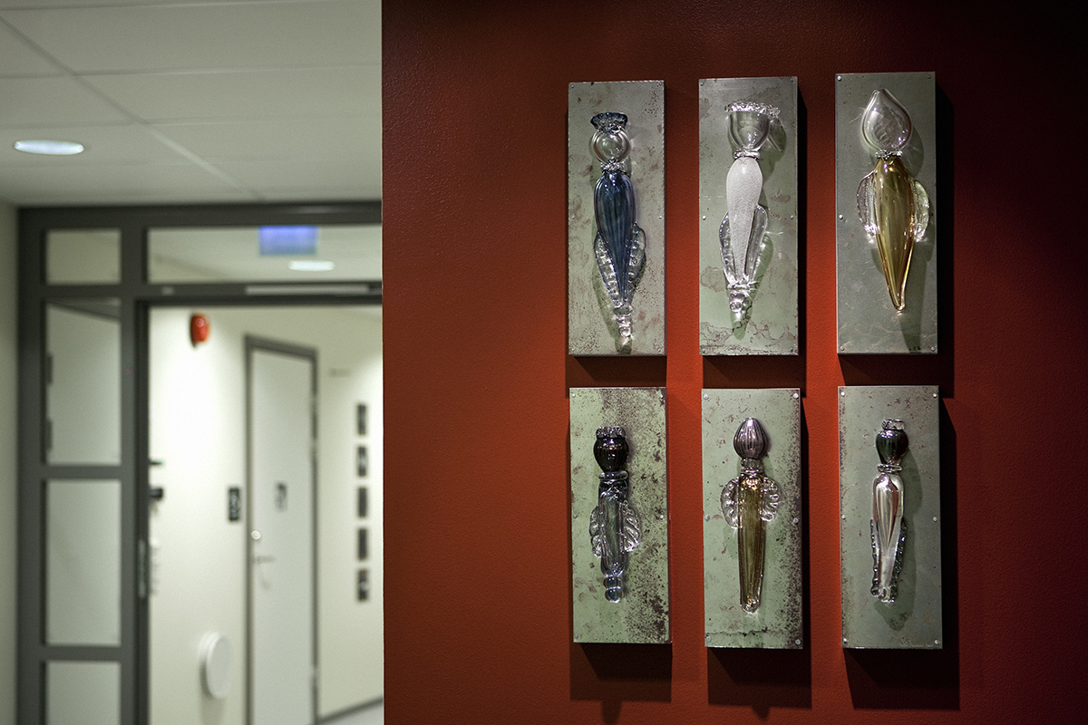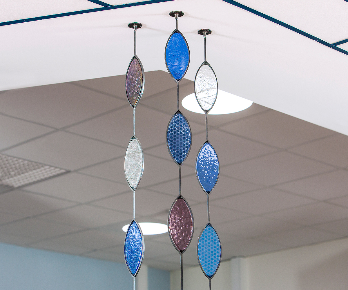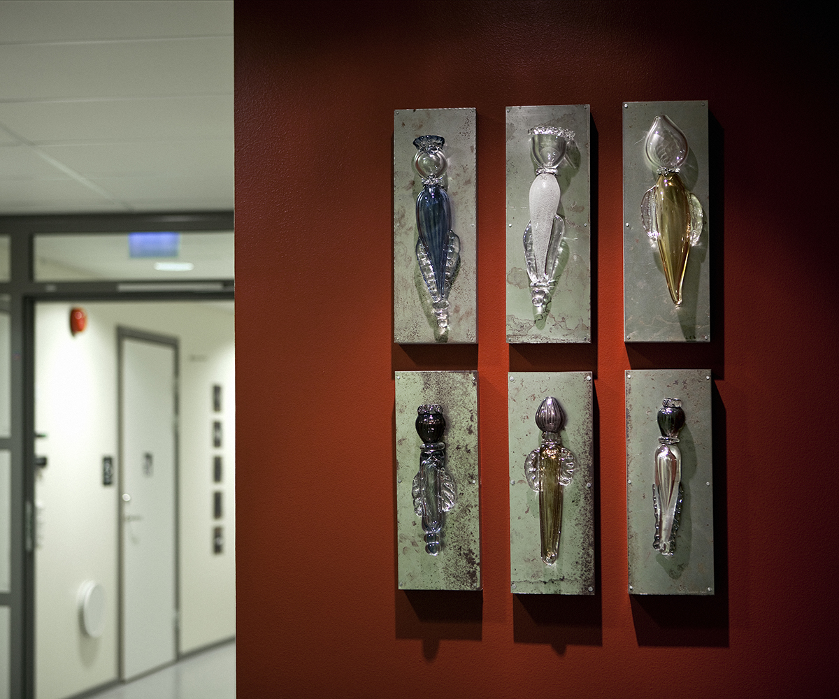 En lugn och vilsam avgränsning från disk och korridor på IVA avdelningen. Lövformationer i fusingteknik med reliefer och mönster i glasfärg. Glaslöven är infattade i laserutskurna järnramar.