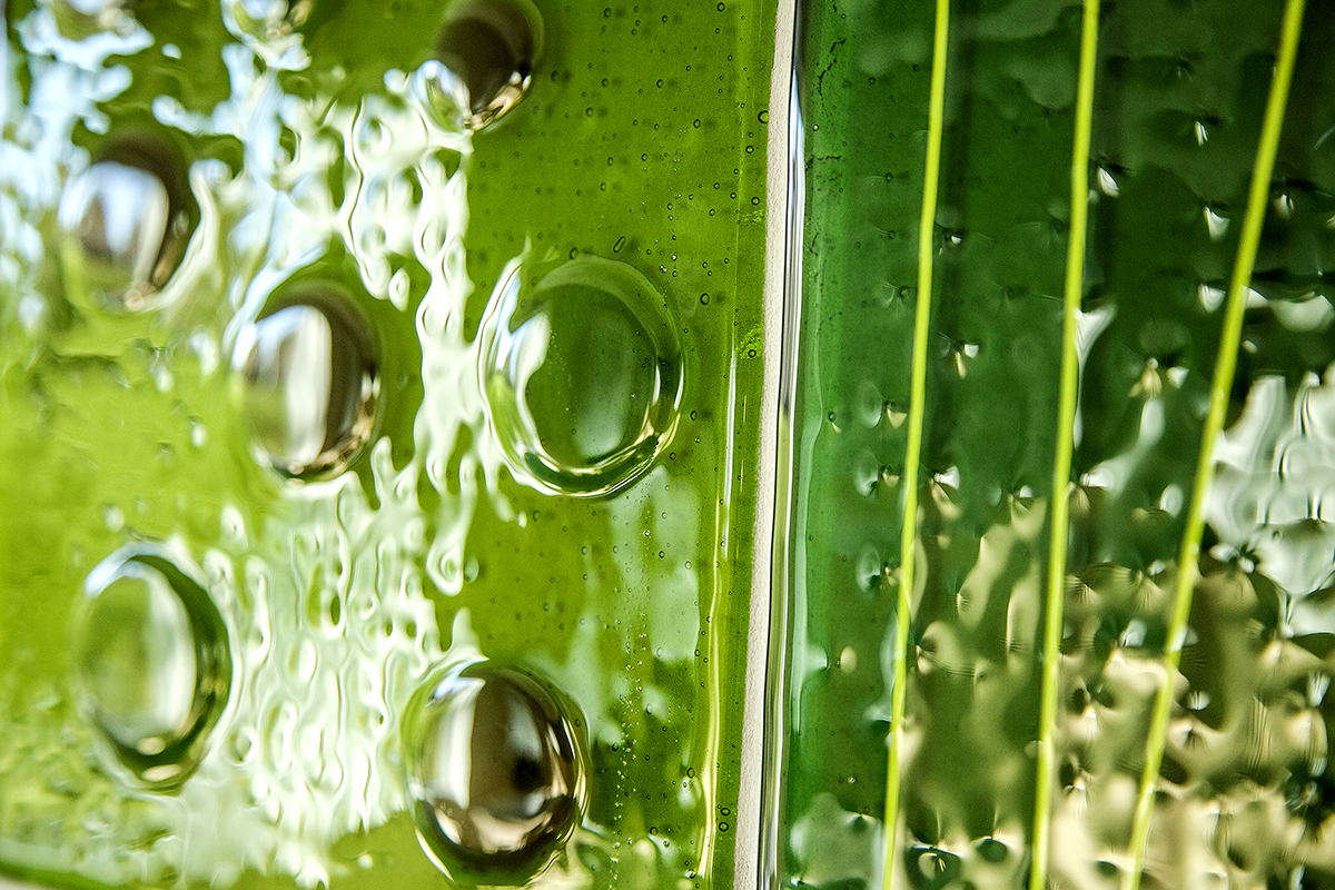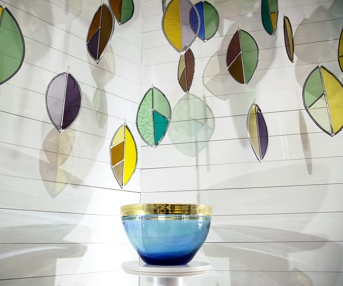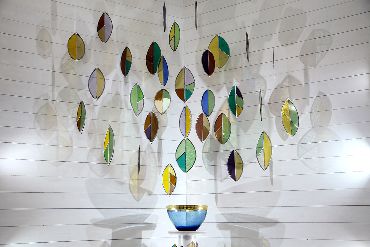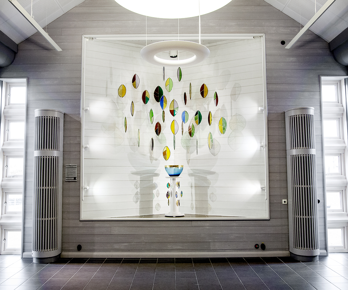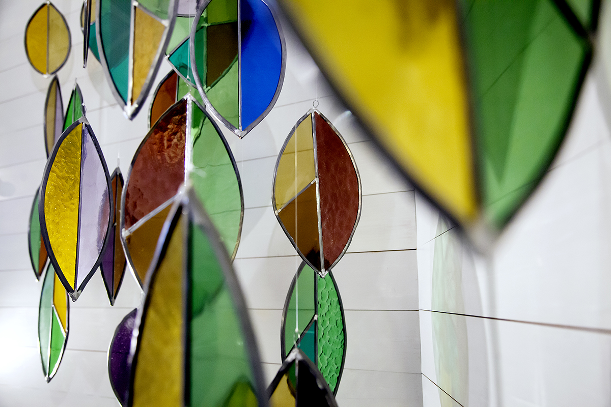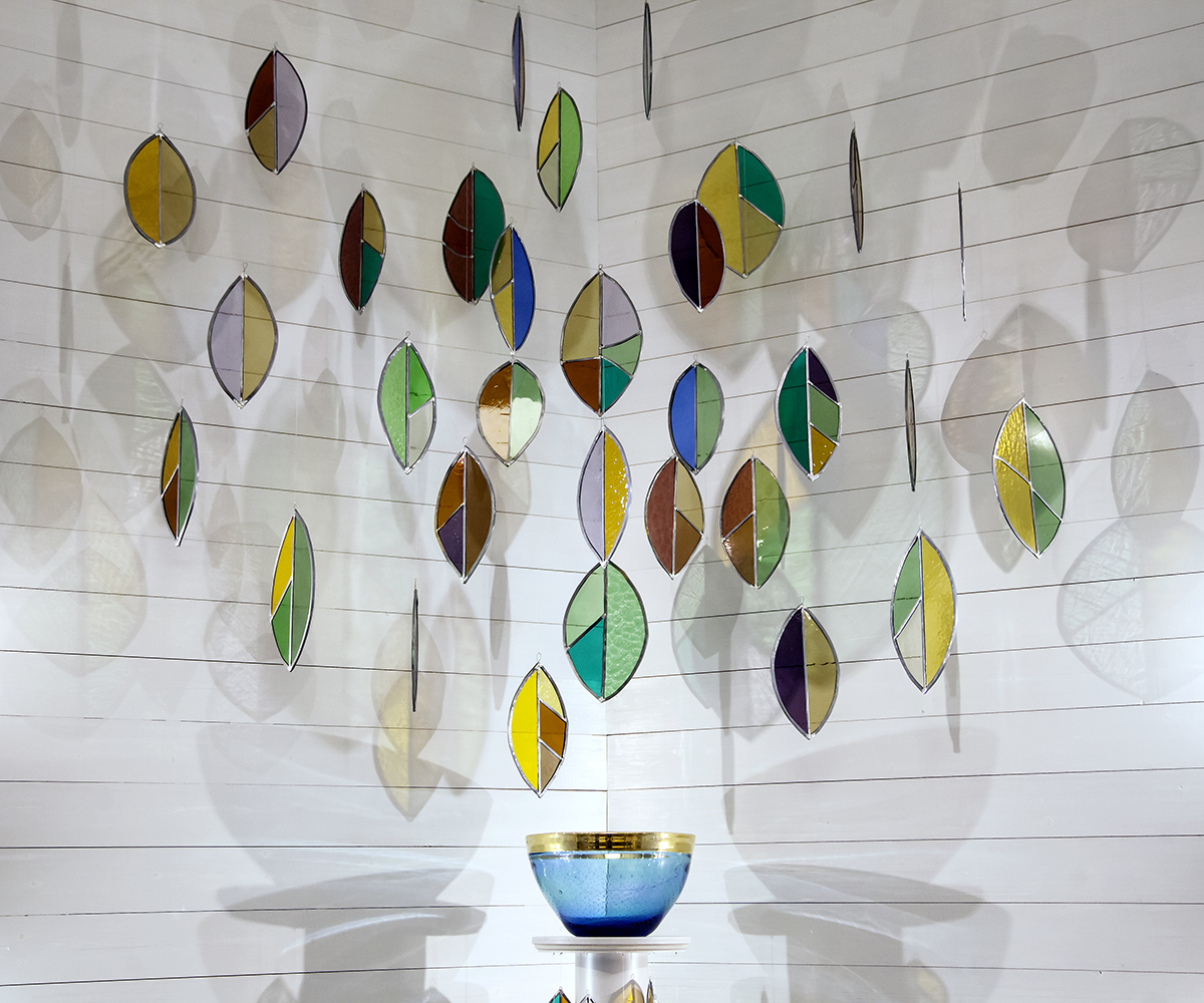 En lugn och vilsam avgränsning från disk och korridor på IVA avdelningen. Lövformationer i fusingteknik med reliefer och mönster i glasfärg. Glaslöven är infattade i laserutskurna järnramar.