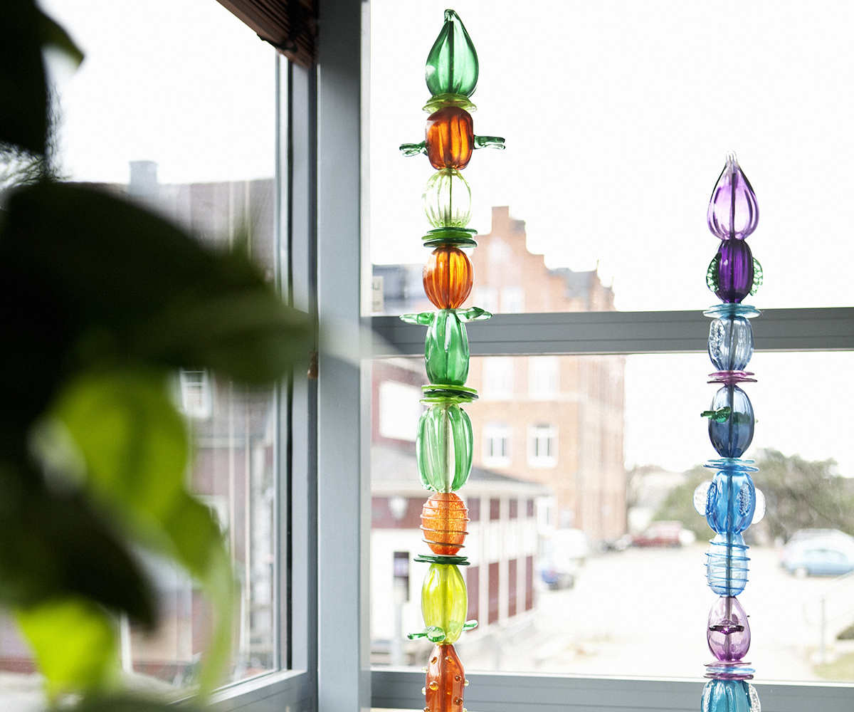 Friskolan Tant Grön gav mig i uppdrag att göra en välkomnande entré för de minsta barnen på skolan. Jag valde att göra två fruktspett, liknande de Baloo i Djungelboken jonglerar med. De består av frihandsblåsta olikfärgade glasformer med påklipp, stående på betongfundament som kaklats med egenhändig framställd glasmosaik. Lekfullhet och igenkänning präglar denna gestaltning.