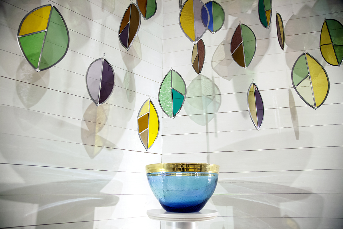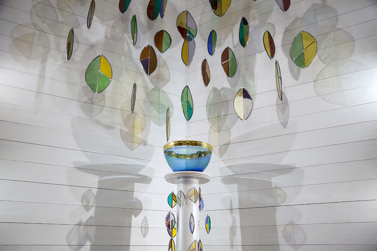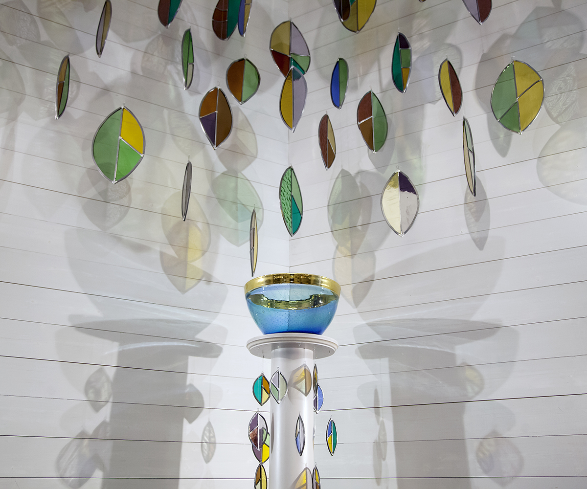 Petrusgården är kyrkans församlingshem. I samband med sin ombyggnation anlitade församlingen mig att göra en konstnärlig gestaltning i Malmbergssalen. Jag valde här att arbeta med blyinfattat glas som bildar ett ”Livets Träd” med en tillhörande frihandsblåst stor skål där man både kan ha blomsterarrangemang eller tända ljus flytande i vatten vid speciella tillfällen.
