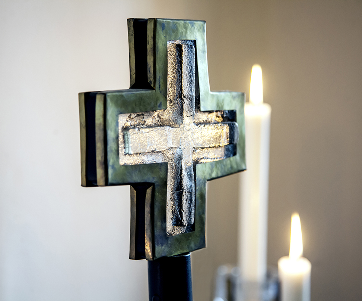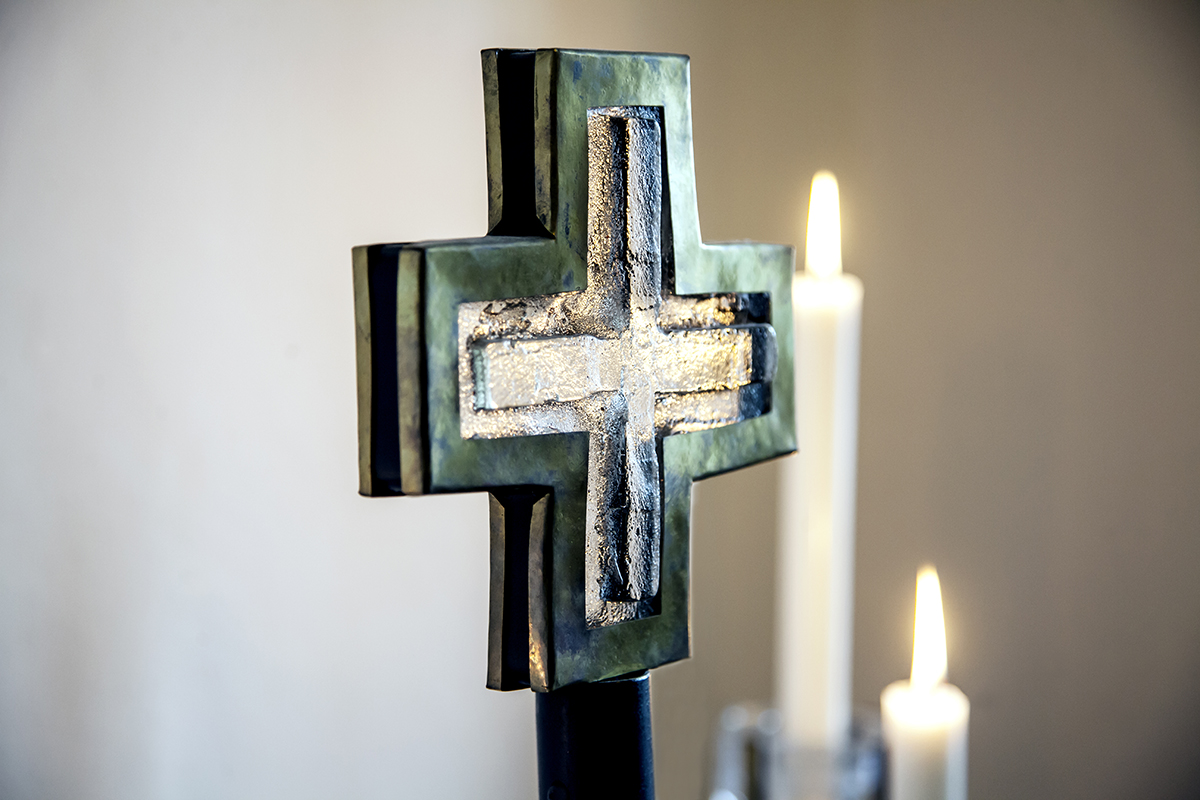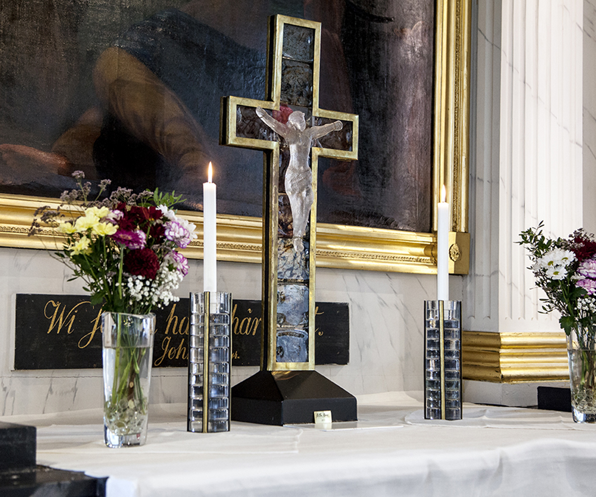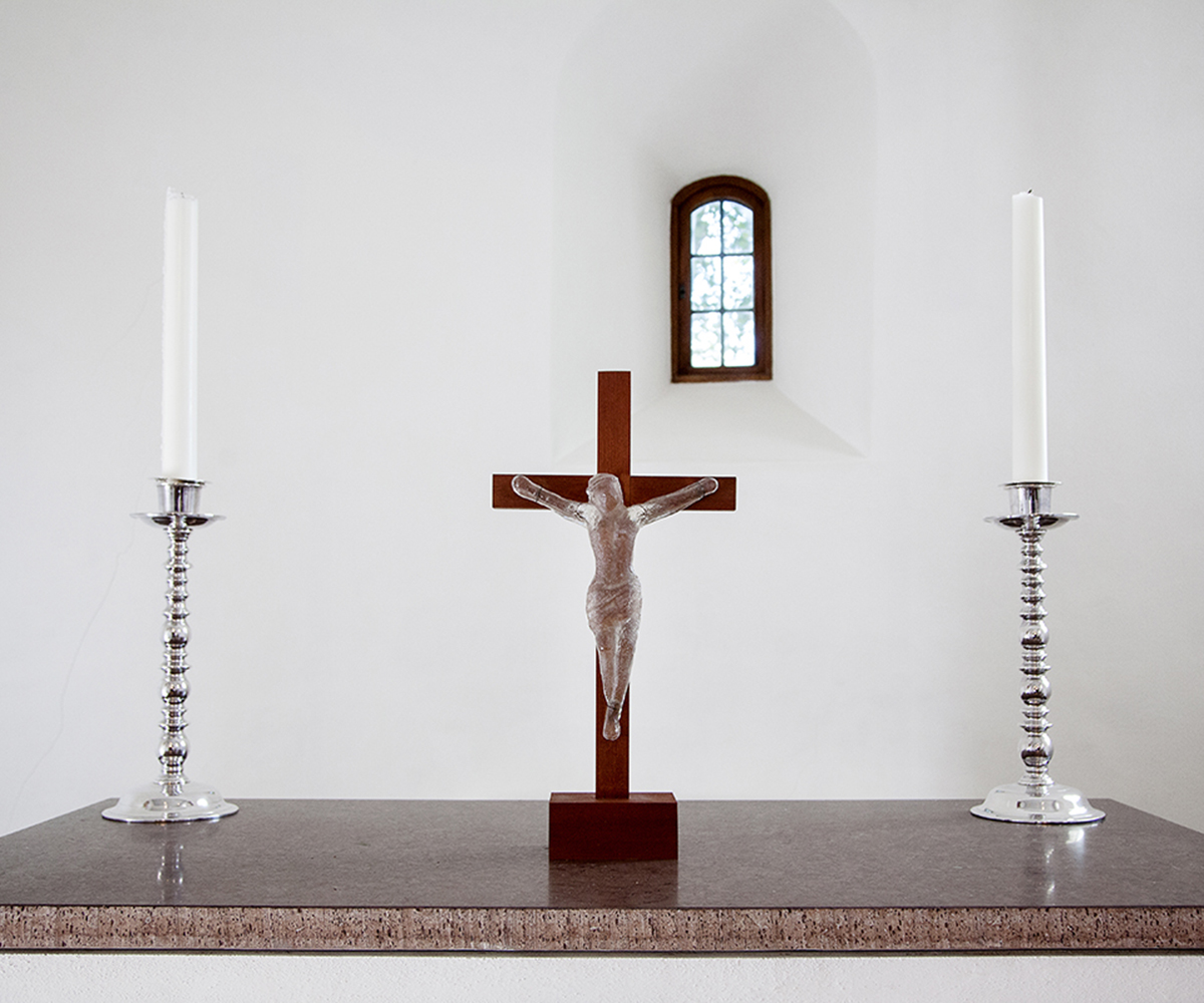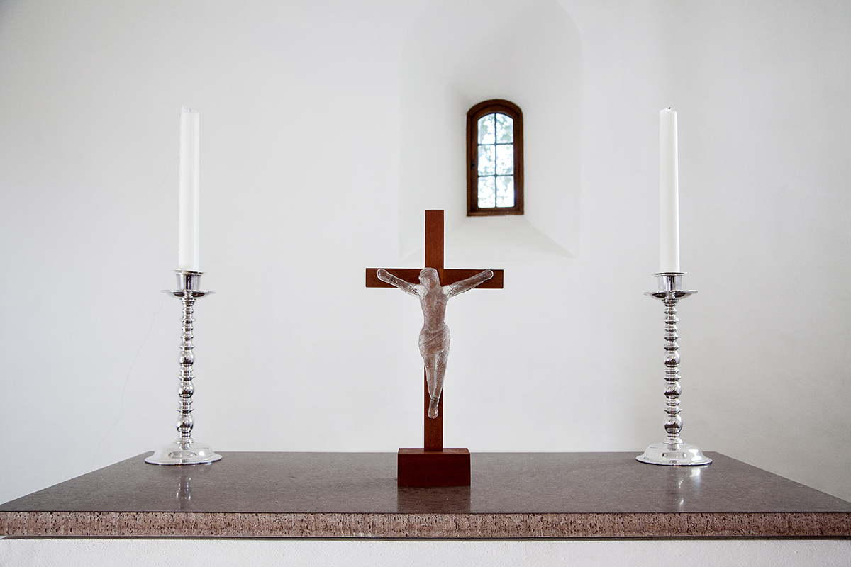 Efter att ha tillverkat ”Livets Träd” i församlingshemmet bad kyrkorådet mig att göra ett altarkors med tillhörande ljusstakar samt korkors som placerades i kyrkans sakristia. Altarkorset är gjort av gjutna glasblock med mässingsdetaljer och Kristus är tillverkad sandgjutet glas. 2016 tillverkade jag även lilla kapellets kors och ljusstakar.