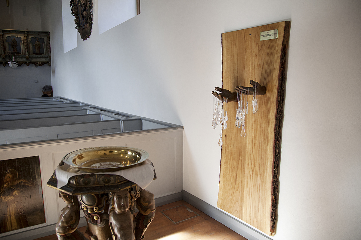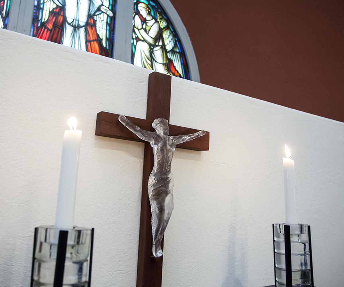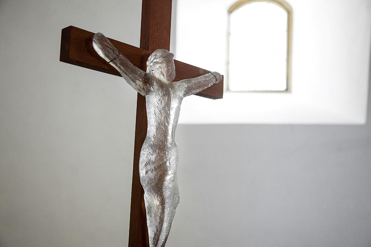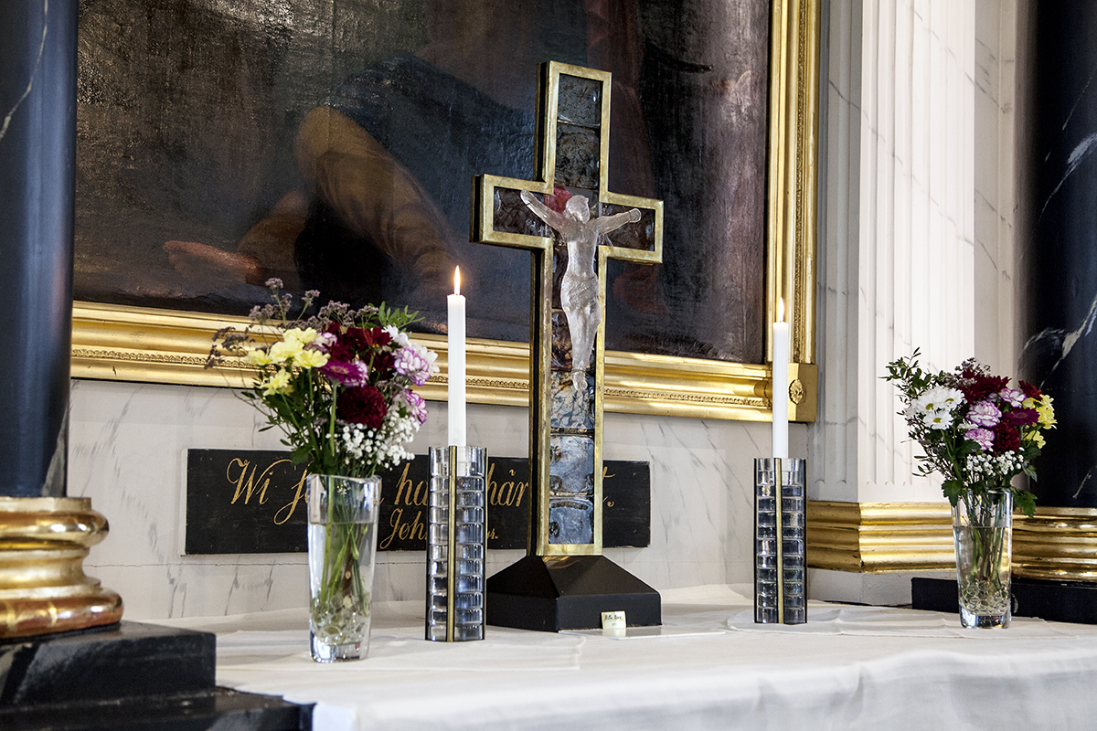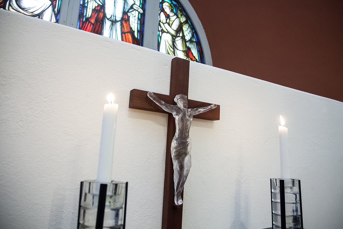 Efter att ha tillverkat ”Livets Träd” i församlingshemmet bad kyrkorådet mig att göra ett altarkors med tillhörande ljusstakar samt korkors som placerades i kyrkans sakristia. Altarkorset är gjort av gjutna glasblock med mässingsdetaljer och Kristus är tillverkad sandgjutet glas. 2016 tillverkade jag även lilla kapellets kors och ljusstakar.