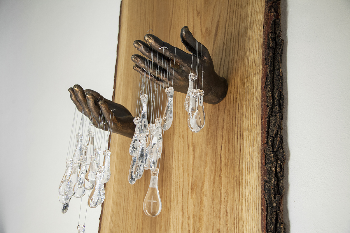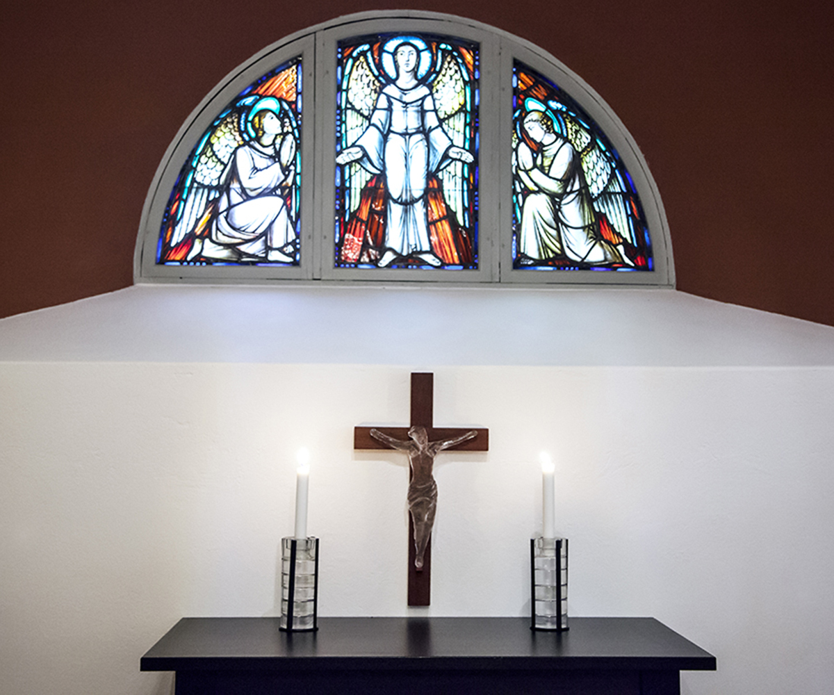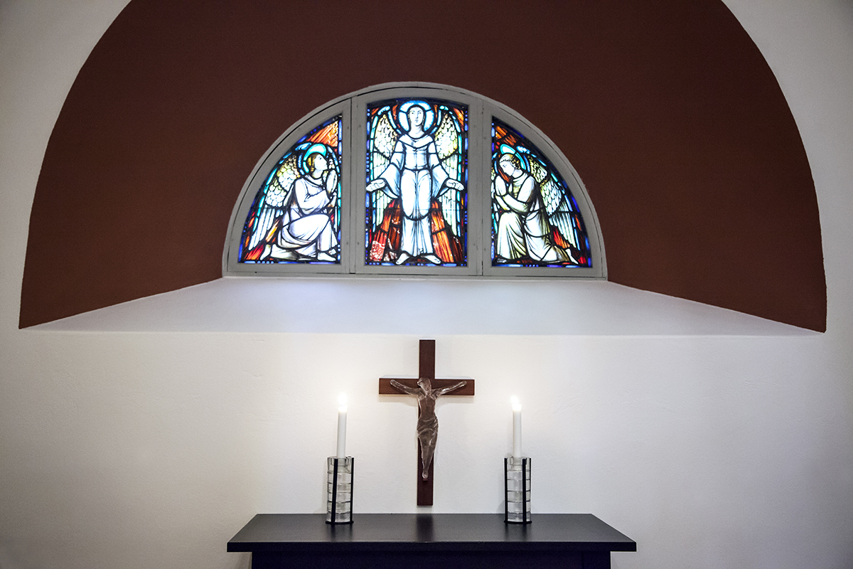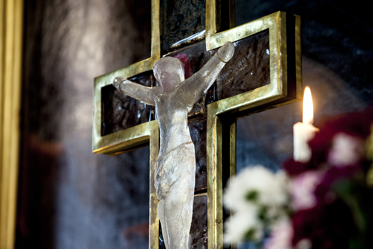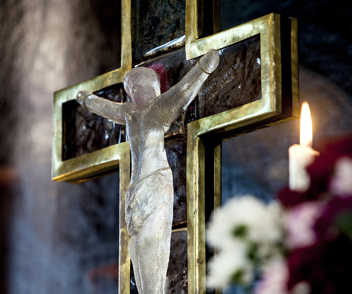 Efter att ha tillverkat ”Livets Träd” i församlingshemmet bad kyrkorådet mig att göra ett altarkors med tillhörande ljusstakar samt korkors som placerades i kyrkans sakristia. Altarkorset är gjort av gjutna glasblock med mässingsdetaljer och Kristus är tillverkad sandgjutet glas. 2016 tillverkade jag även lilla kapellets kors och ljusstakar.