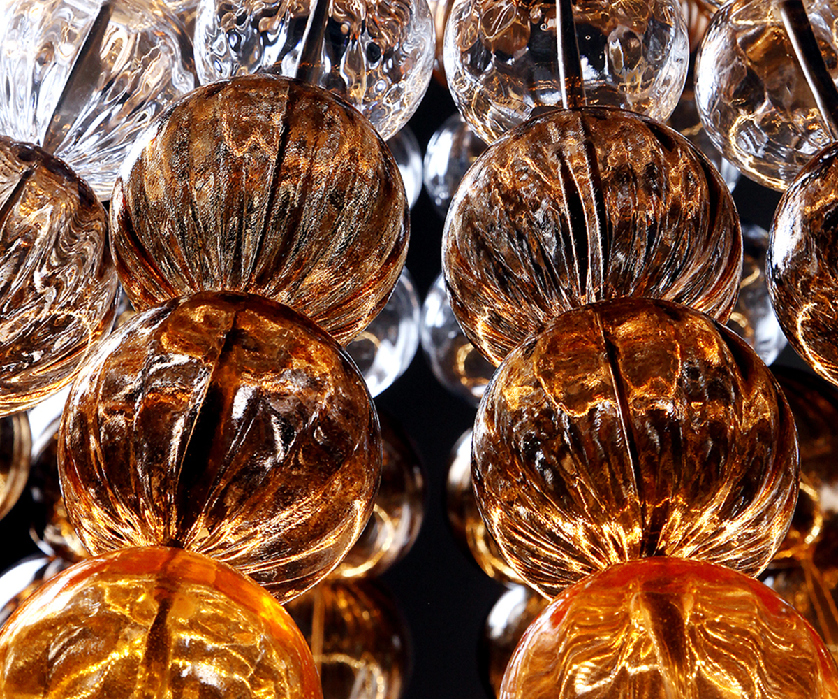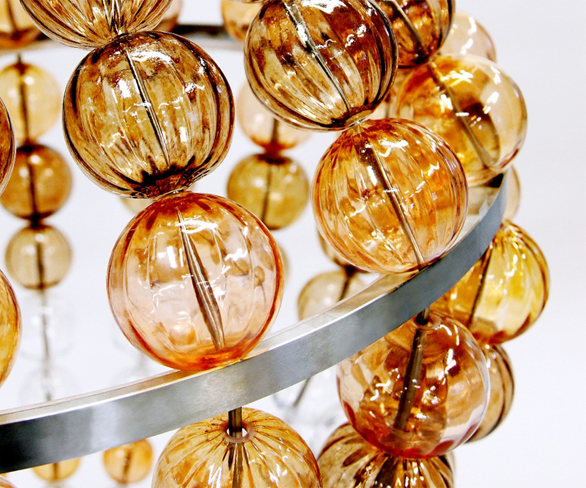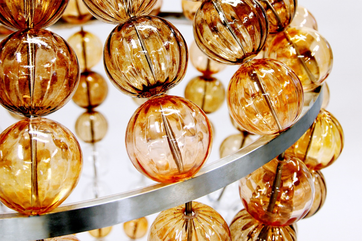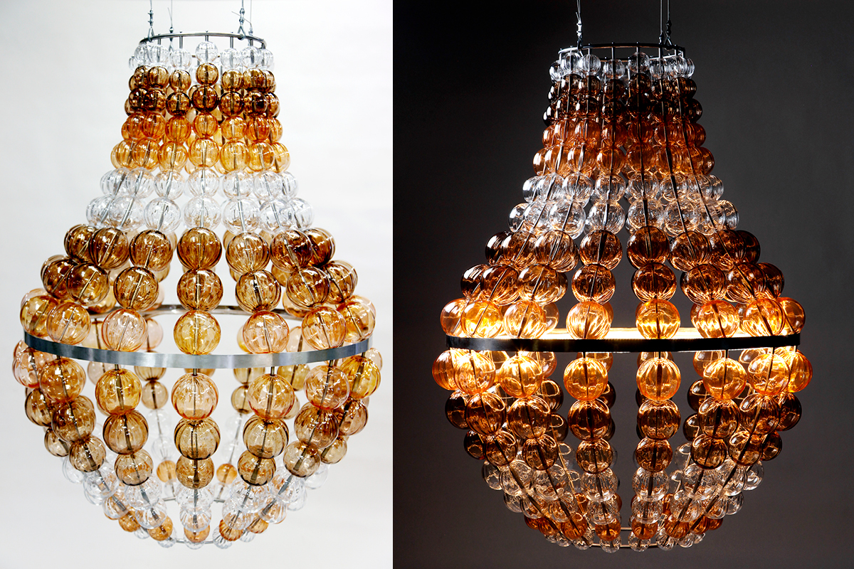 En privat kund kontaktade mig för att göra en stor takkrona till sitt vardagsrum. Jag ville skapa känslan av en moderniserad kristallkrona då jag blåste ca 400 st färgade och klara optikkulor som därefter genomborrades i båda ändar. Skelettet lät jag tillverka i rostfritt borstat stål och valde en ledbelysning upp och nertill i mittenringen av kronan.
