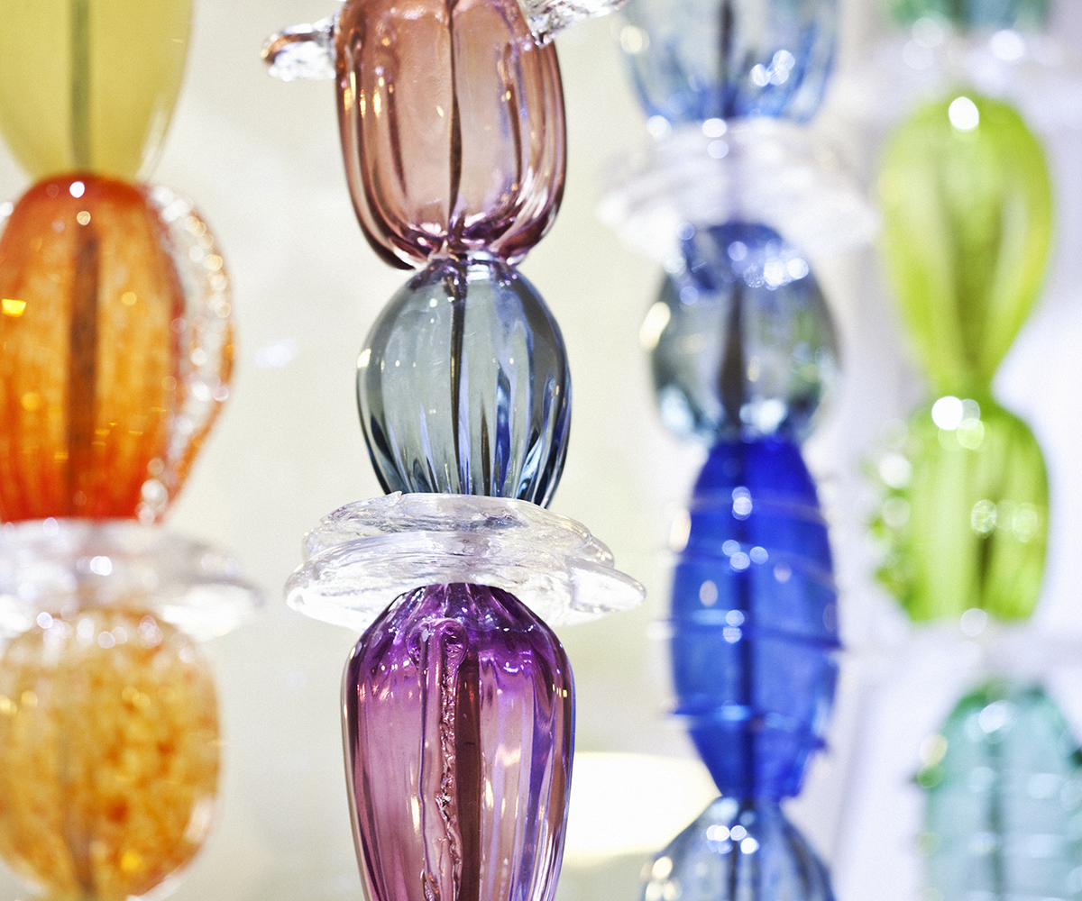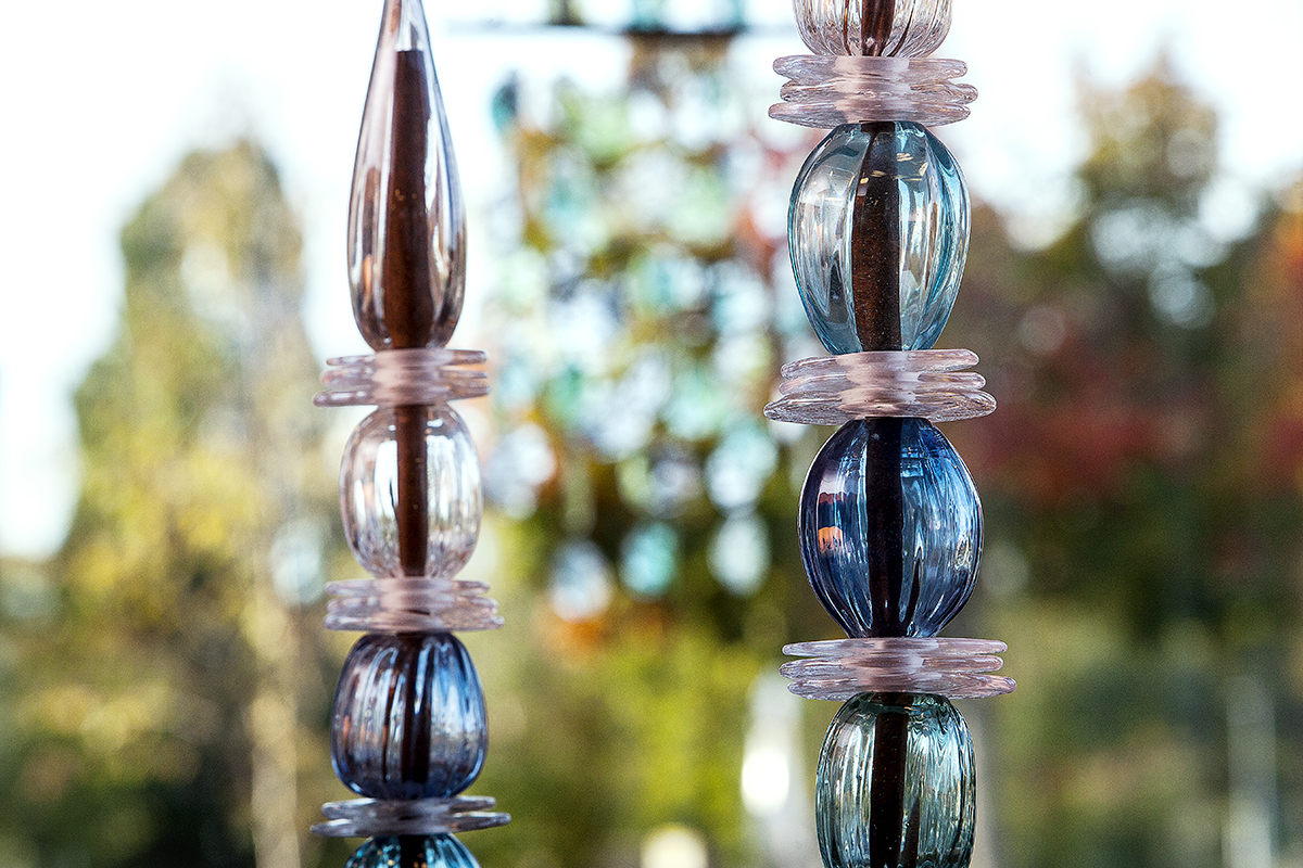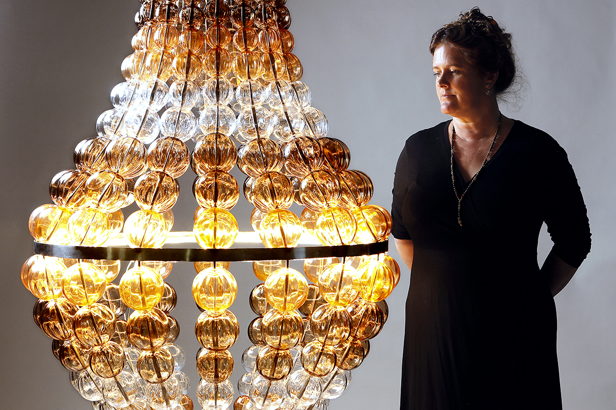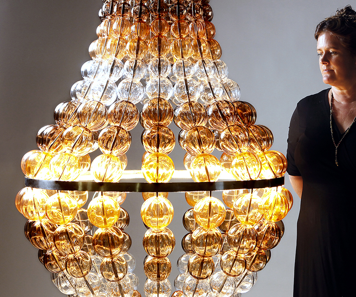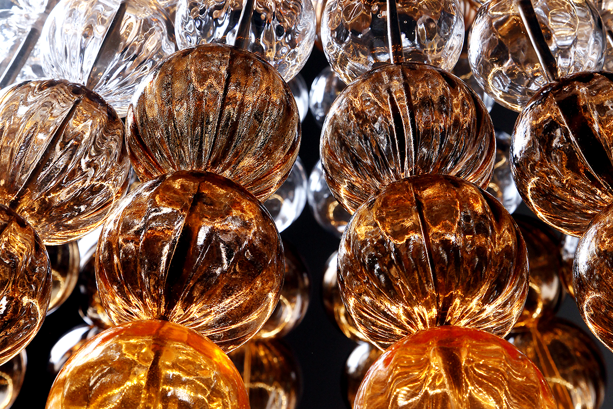 En privat kund kontaktade mig för att göra en stor takkrona till sitt vardagsrum. Jag ville skapa känslan av en moderniserad kristallkrona då jag blåste ca 400 st färgade och klara optikkulor som därefter genomborrades i båda ändar. Skelettet lät jag tillverka i rostfritt borstat stål och valde en ledbelysning upp och nertill i mittenringen av kronan.