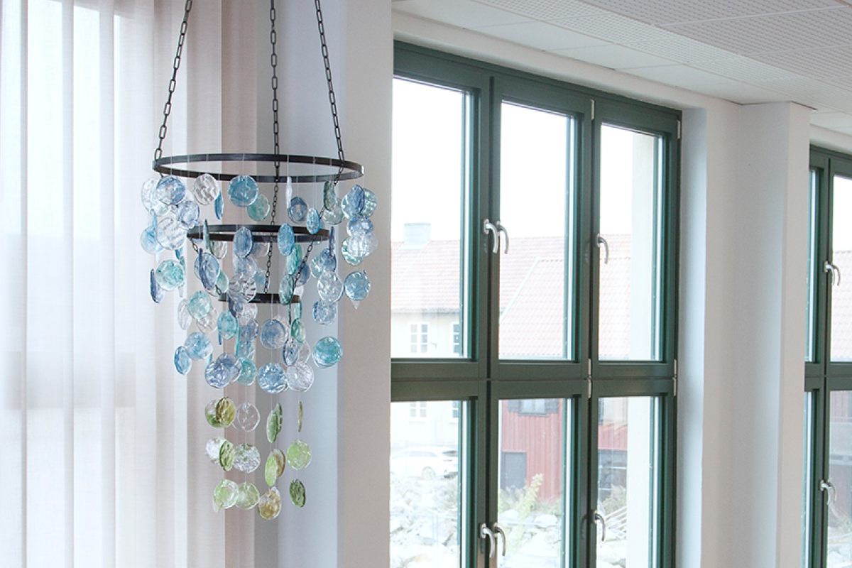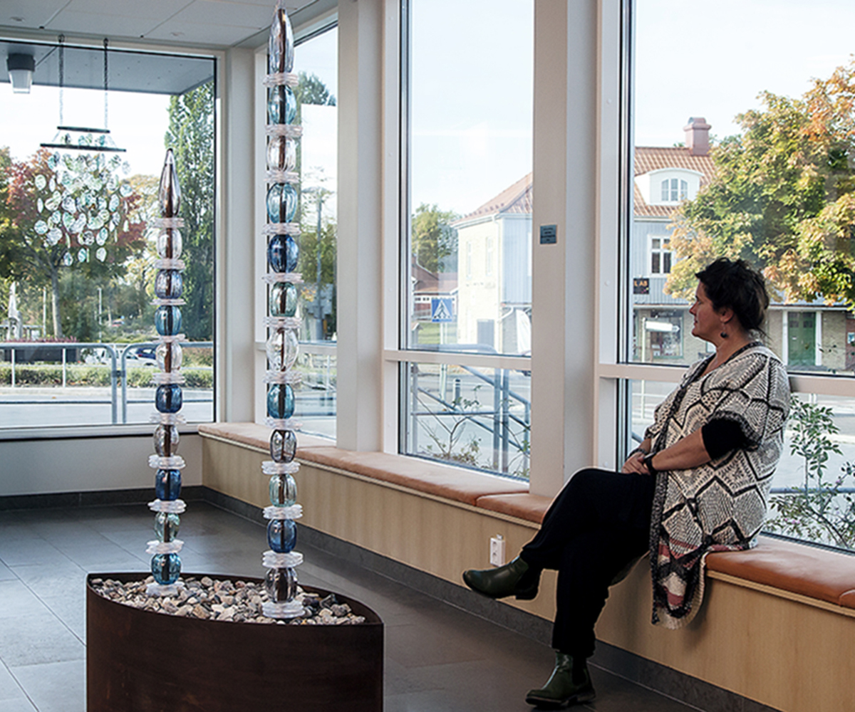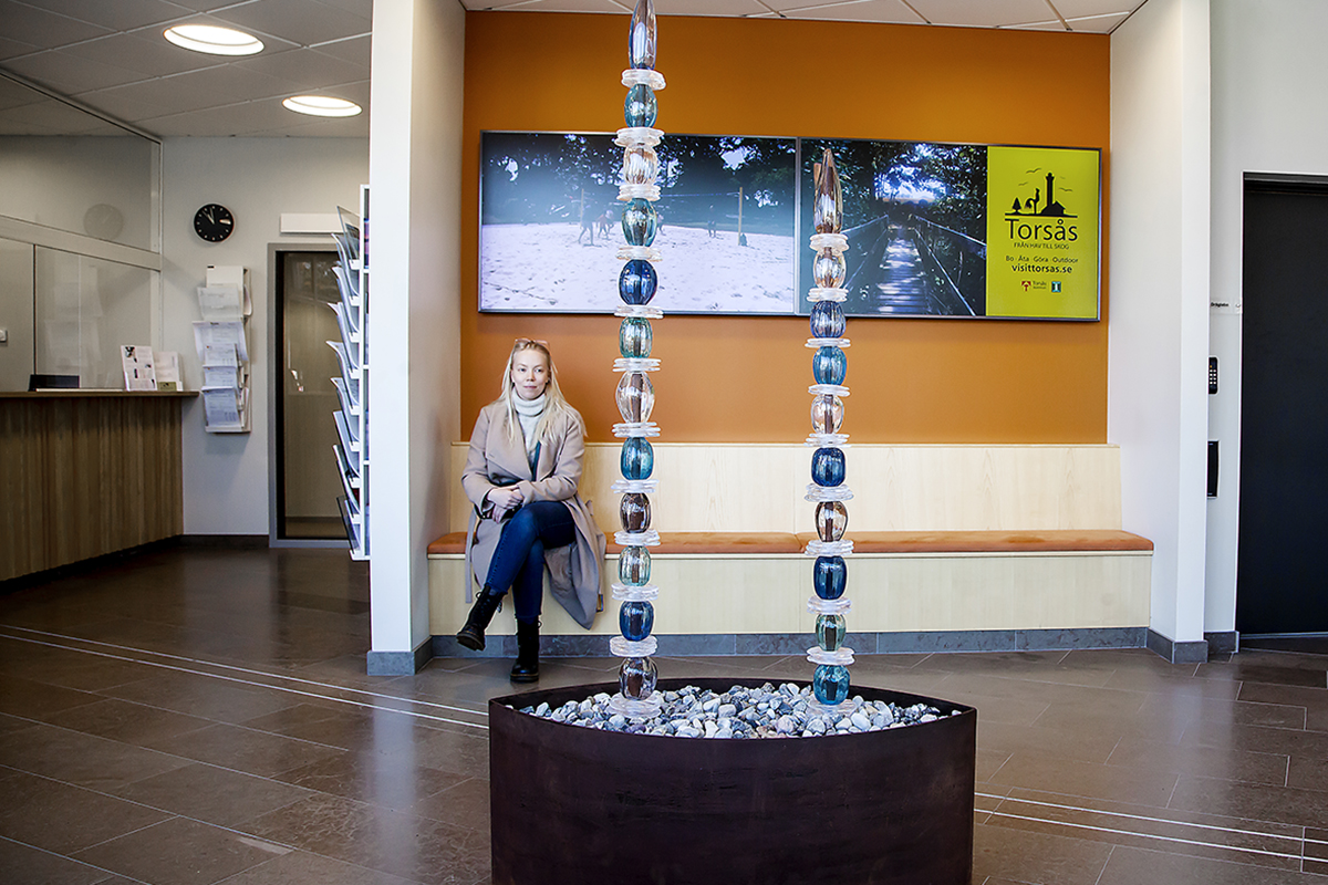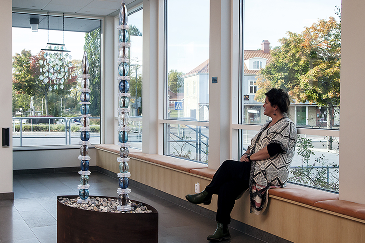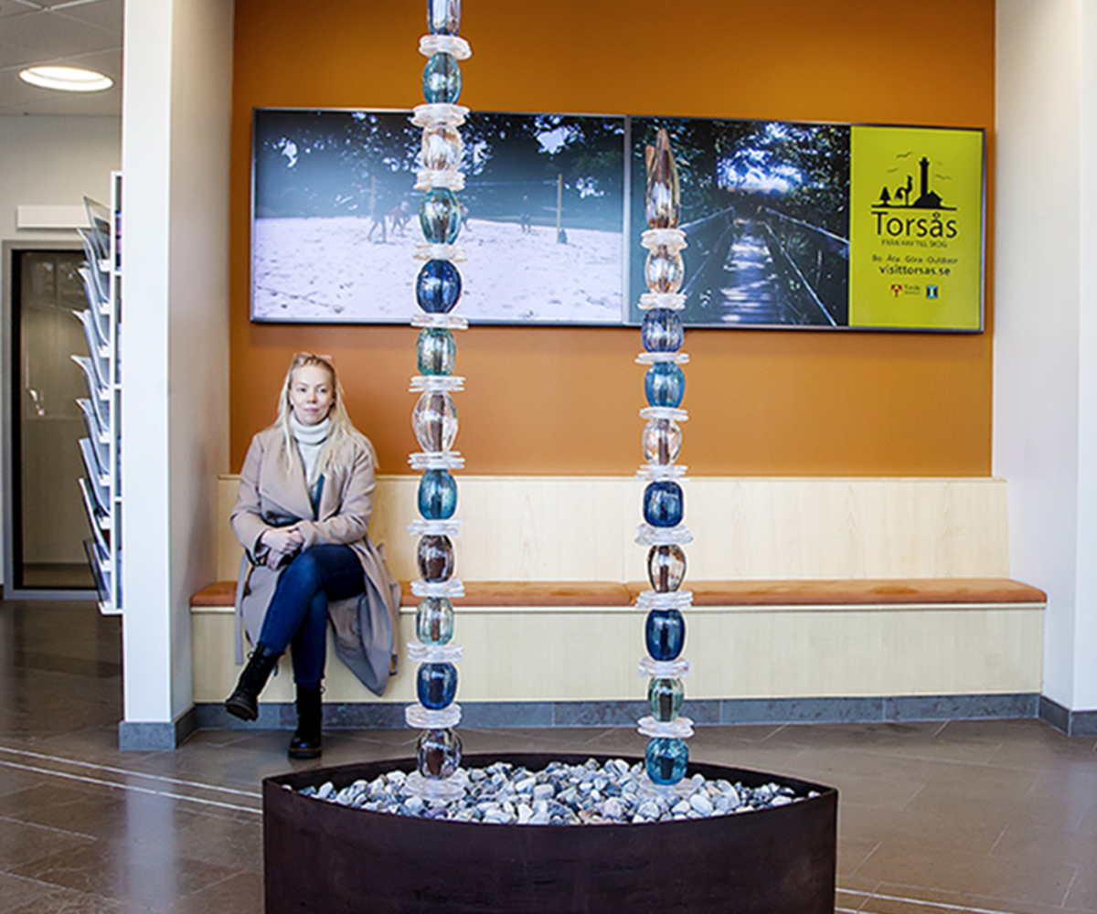 Mitt förslag vann en utlysning att göra ett konstnärligt gestaltningsuppdrag åt Torsås kommunhus entré. Torsås kommun sträcker sig från havet med sin vackra kust upp till de småländska skogarna. Jag valde därför att gestalta havet likt en båtform i rostig cortenplåt med master av optikformade glasformationer. I fönstret hänger en glasmobil i gröna nyanser som symboliserar skogens alla skiftningar.