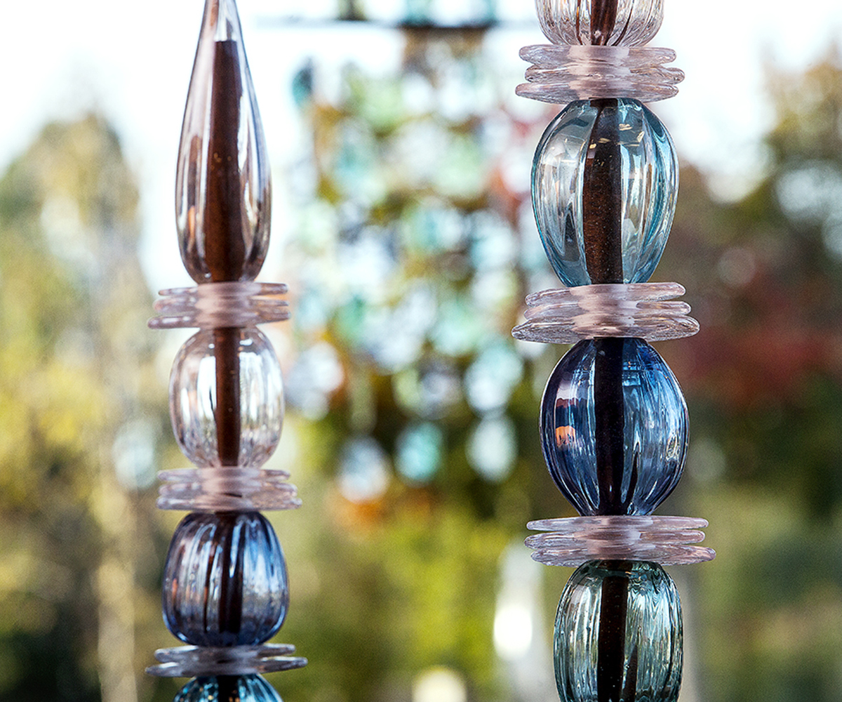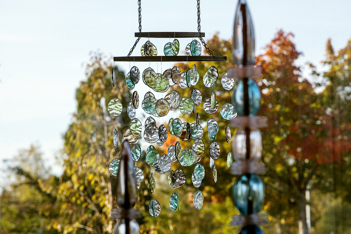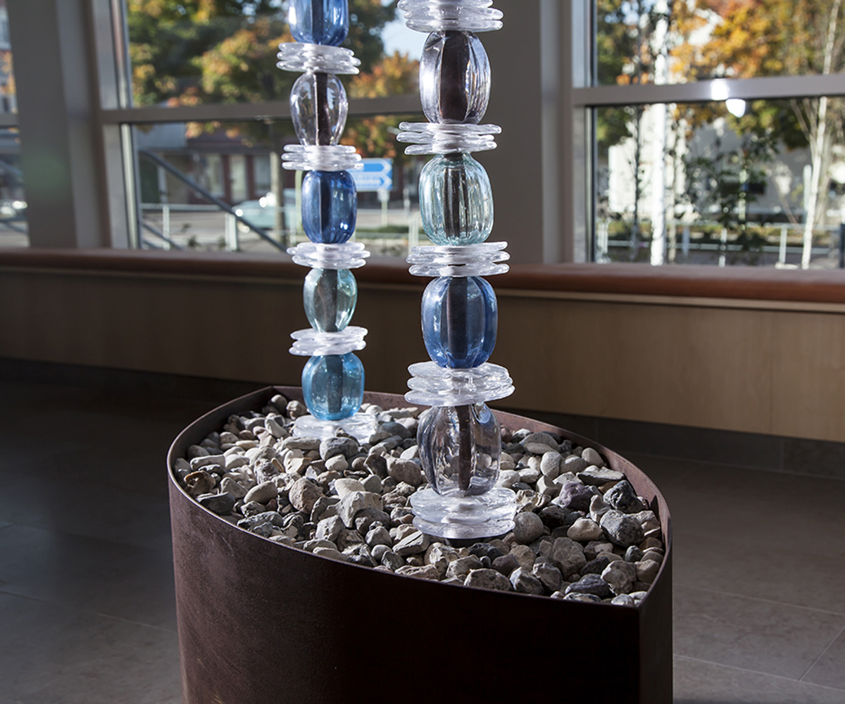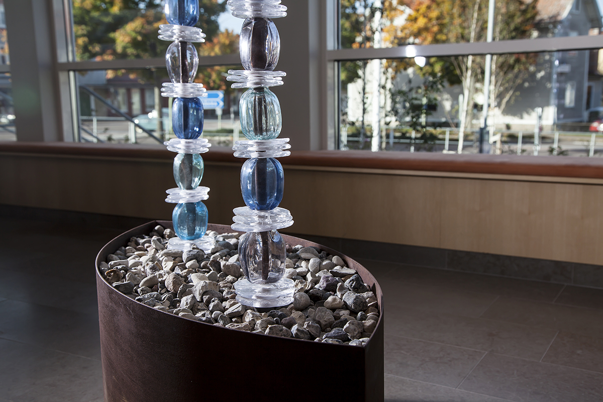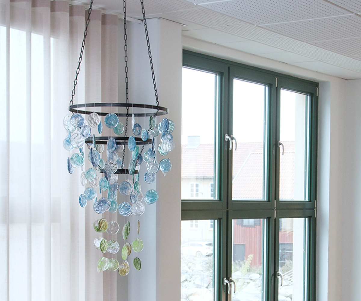 Mitt förslag vann en utlysning att göra ett konstnärligt gestaltningsuppdrag åt Torsås kommunhus entré. Torsås kommun sträcker sig från havet med sin vackra kust upp till de småländska skogarna. Jag valde därför att gestalta havet likt en båtform i rostig cortenplåt med master av optikformade glasformationer. I fönstret hänger en glasmobil i gröna nyanser som symboliserar skogens alla skiftningar.