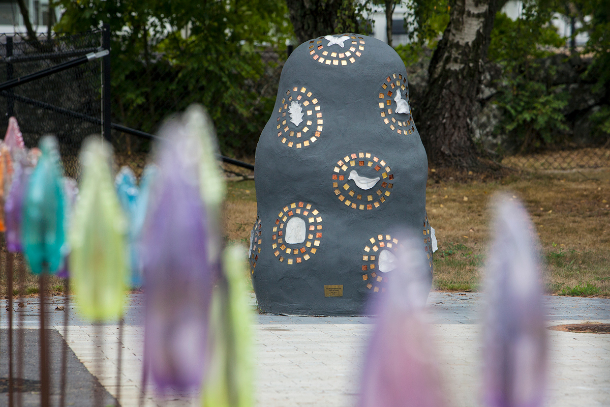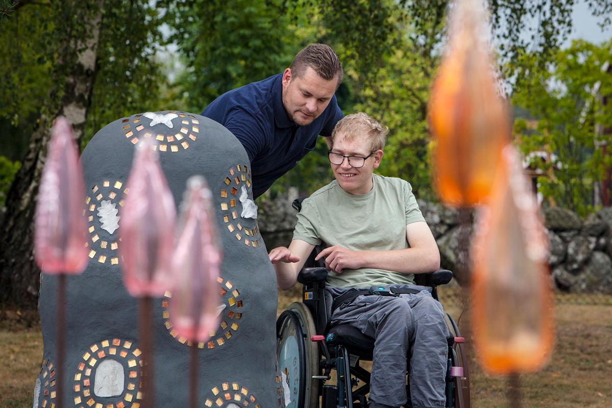 Med detta konstverk ville jag skapa kommunikation och delaktighet för de personer som vistas på den dagliga verksamheten. Detta gjordes genom att låta brukarna själva samla in naturföremål såsom pinnar, stenar, löv och snäckor, men även andra saker som kan symbolisera varje deltagares personliga skatt, exempelvis sitt favoritdjur. Av denna insamlade information gjorde jag avgjutningar i glas och fäste dem på betongskulpturen som små personliga skatter, omringade av guldfärgad kristall-mosaik. Du går genom regnbågsfältet av skimrande glas ner till skatten som får bli en naturlig mötesplats för brukarna.