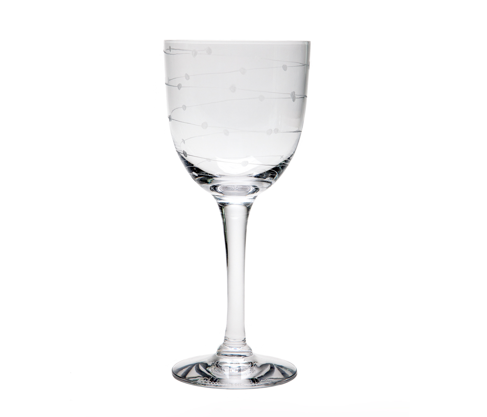 Frihandsblåst vinglas i träform med sprängd kant och ytgravering. Varje glas är unikt varför det kan variera en del på de olika exemplaren